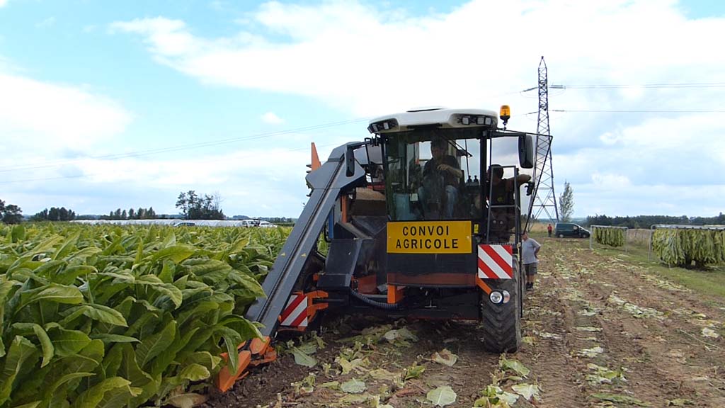 Machine automotrice agricole pour la récolte des pieds de tabac type BURLEY pour stockage sur cadre, direct sur la parcelle et non dans le séchoir à tabac.